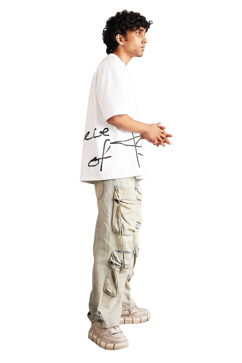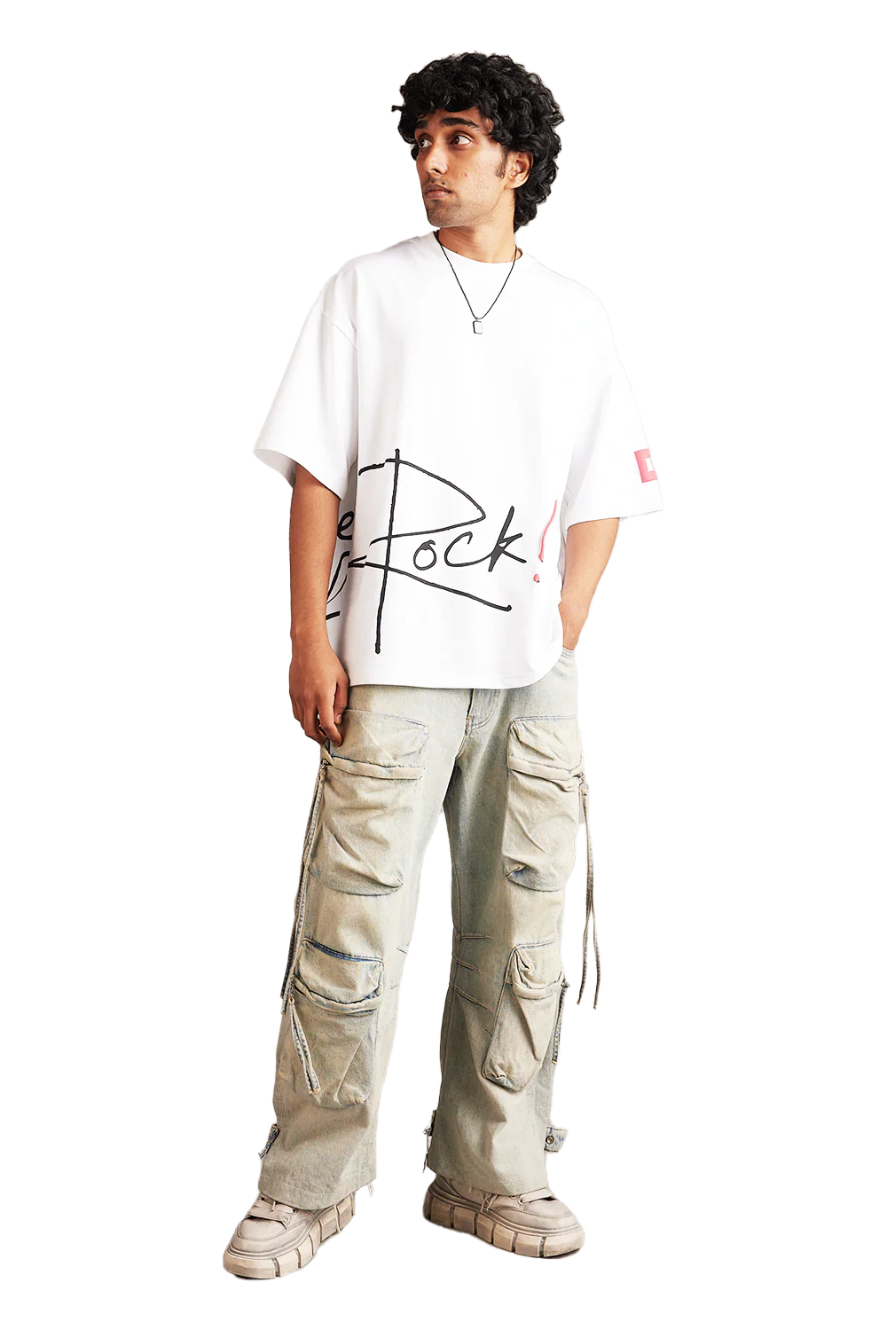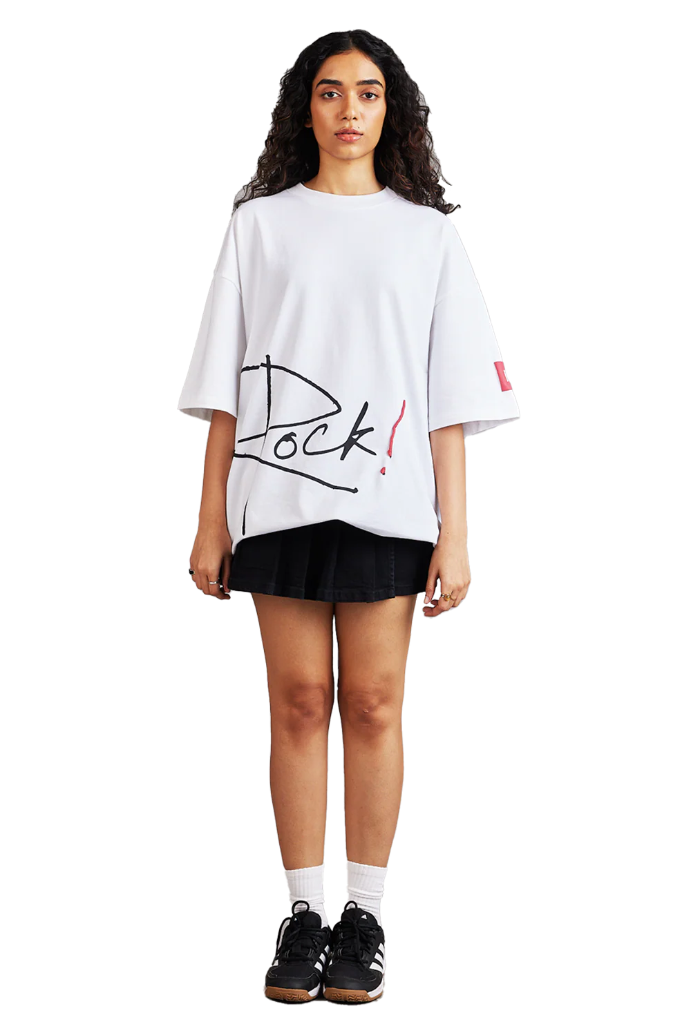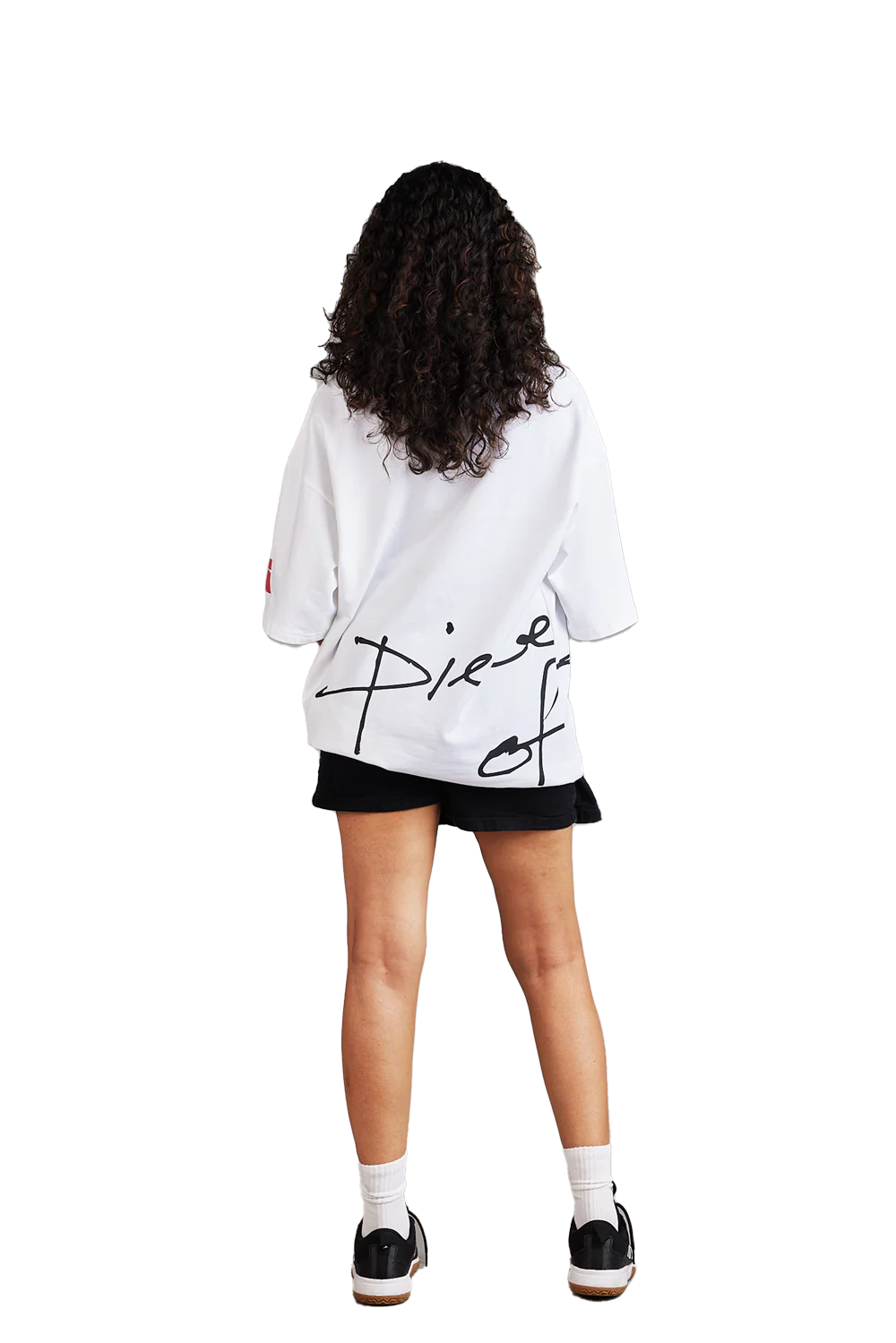 White Unisex Oversized Tee with ‘Piece of Rock’ wrap around print in a signature font.